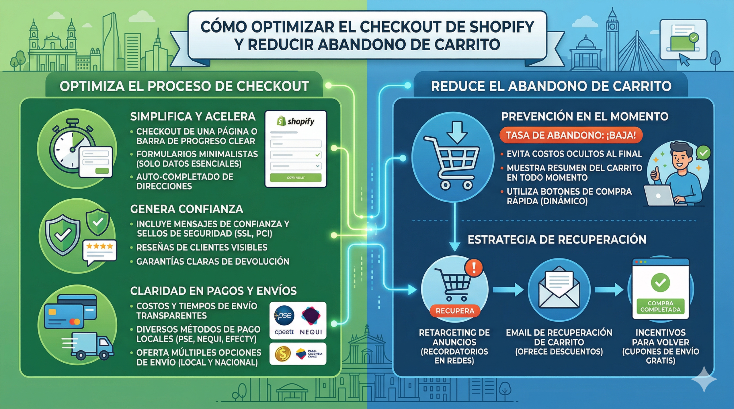 Reduce el abandono de carrito hasta un 20% en tu Shopify Colombia. Estrategias y herramientas para optimizar tu checkout y disparar...