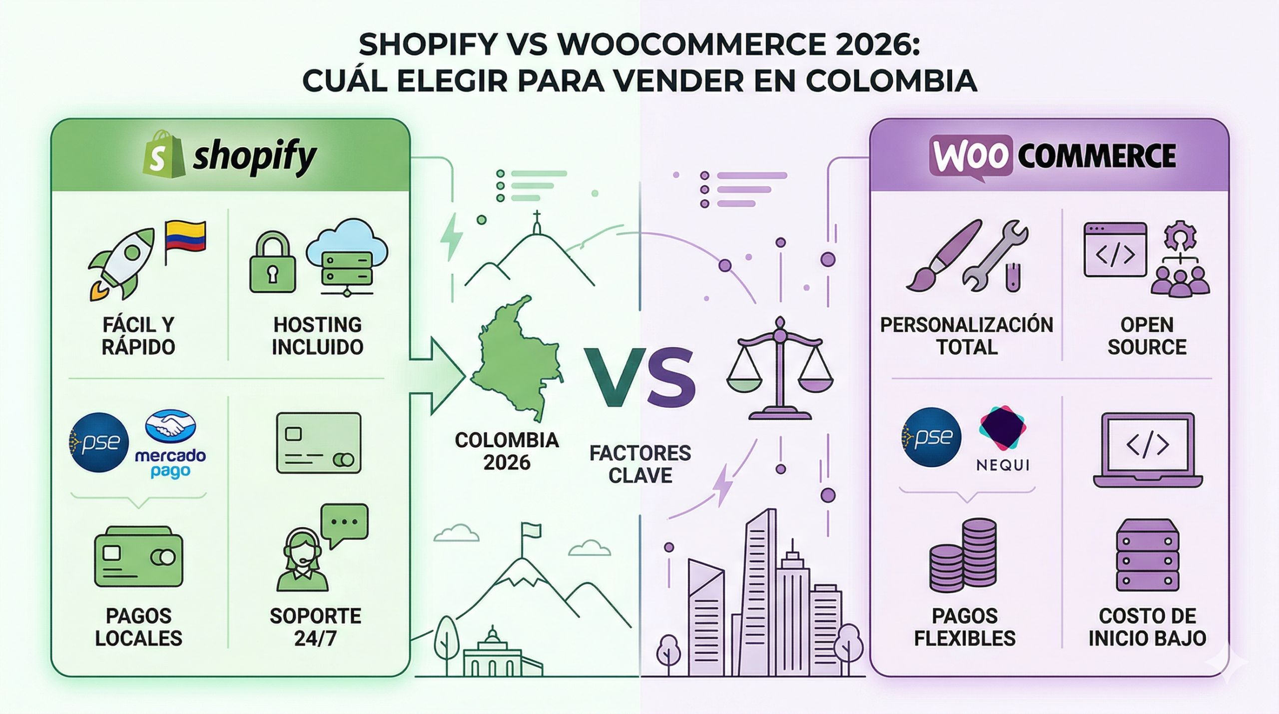 Compara Shopify vs WooCommerce en 2026 para Colombia. Analiza costos, escalabilidad y personalización de plataformas para tu eCommerce. Elige bien y...